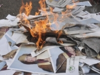 Fotografias de Khadafi foram queimadas e rasgadas ao som de música árabe e fogos de artifício.