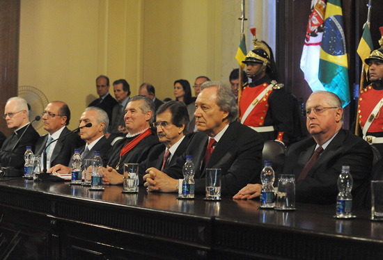 Na foto, governador Geraldo Alckmin; vice-presidente da República, Michel Temer; presidente do TJ, Ivan Sartori; presidente do STF (Supremo Tribunal Federal), ministro Cezar Peluzo; ministro do STF, Ricardo Lewandowski e o presidente da Assembleia paulista, deputado Barros Munhoz.