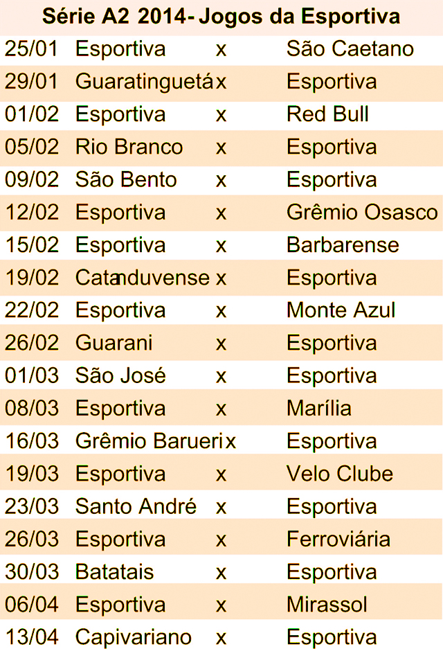 A Esportiva fará sua estréia na Série A-2 diante do São Caetano, jogando na noite de 25 de janeiro, no estádio Chico Vieira. A FPF (Federação Paulista de Futebol)divulgou esta semana a tabela da competição.