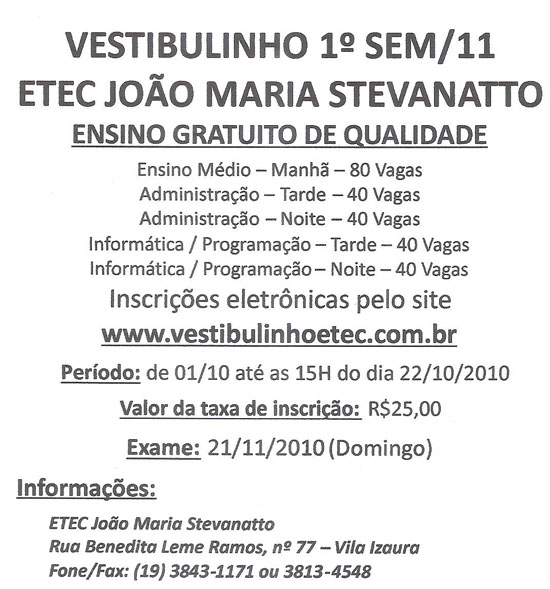 07/10/2010 | ETEC abre inscrições para o vestibulinho