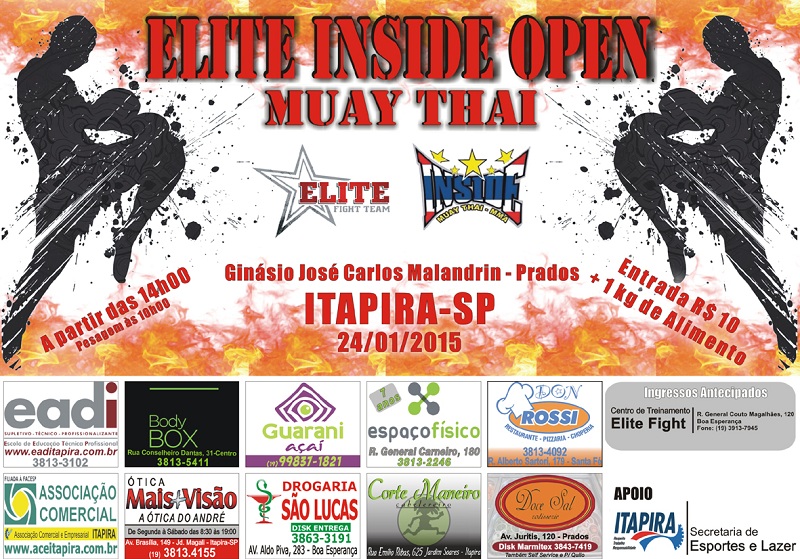 Itapira abriga no próximo dia 24 o 1º Elite/Inside Open de Muay Thai. O evento que reunirá lutadores de diversas regiões do estado de São Paulo e sul de Minas Gerais terá cerca de 50 lutas acontecendo a partir das 14h00 no Ginásio Municipal de Esportes José Carlos Malandrin, no bairro Prados. Os organizadores estimam que sejam pelo menos seis horas de combates em diversas categorias, masculinas e femininas.