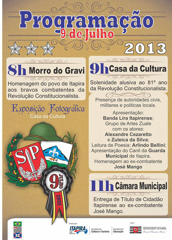 A agenda tem início às 8 horas de terça-feira no Morro do Gravi, palco de um dos mais violentos combates da Revolução de 1932. Em seguida, às 9 horas, defronte à Casa da Cultura "João Torrecillas Filho", acontece uma solenidade lembrando os 81 anos do evento. A Banda Lira Itapirense se apresentará no local, assim como o Grupo de Arte Zuale, com os atores Alexandre Cezaretto e Zuleica Silva.