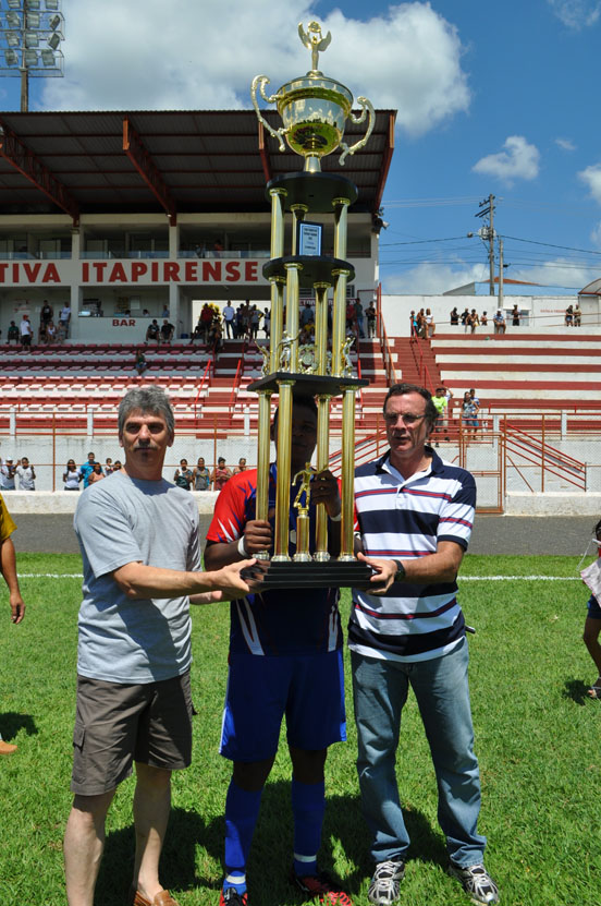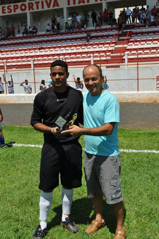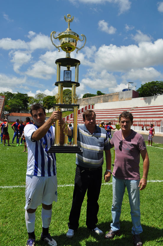 Terrão capitão do Eleutério recebe o troféu de vice campeão do vereador Zé Branco e do diretor de esporte Flávio Boretti.