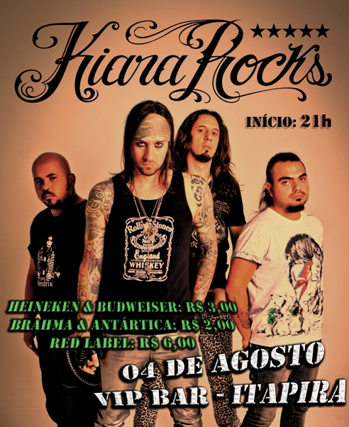 O VIP Eventos recebe, na noite deste sábado (04/11), a banda Kiara Rocks, liderada pelo vocalista e guitarrista Cadu Pelegrini, estrela do programa ‘Solitários’, exibido pelo SBT. O grupo, que também já foi finalista por duas vezes do programa ‘Astros’, da mesma emissora, desembarca pela primeira vez na cidade.