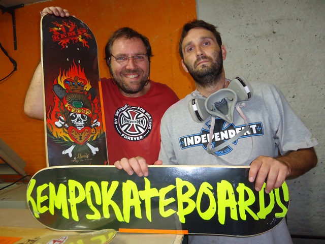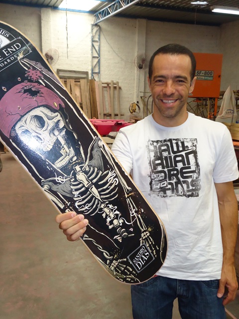 O que o trouxe a Itapira foi um compromisso empresarial. Além de faturar nas pistas mundo afora, Mineirinho há ce rca de dois anos decidiu investir numa mar ca própria de skate, a Till the End. Quem fabrica suas pranchas é a K emp. Coppos explicou que ele, o sócio Beto Vieira e todos seus funcionários são pessoas que necessariamente curtem o mundo do skate e que a convivência com Sandro Dias vem da determinação de participar de e ventos p elo Brasil afora. Recentemente, um amigo em comum contou ao famoso c ampeão da qualidade das pranchas fabricadas em Itapira, despertando o interesse do d ono d a marca. Mi neirinho gostou do que viu e passou a encomendar suas pr anchas para a Kemp, fornecendo a estampa característica.