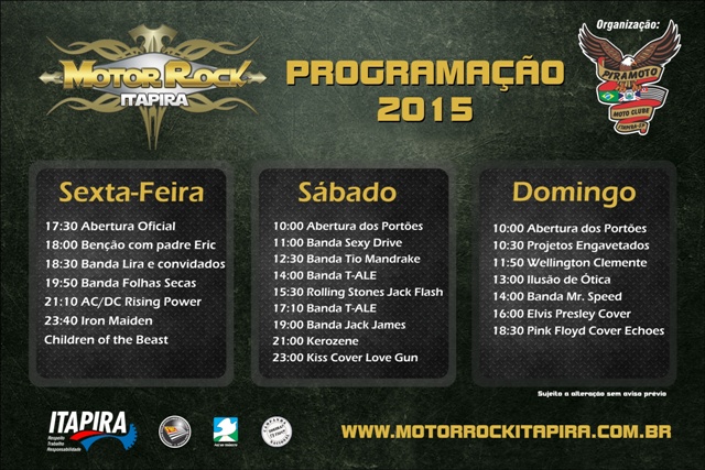 Em um ambiente fraterno e divertido, a edição do Motor Rock 2015 promete superar ainda mais o sucesso pelo qual já é conhecido. “Estamos prontos para, novamente, recebermos nossos irmãos motociclistas e o público em geral que sempre curte muito e se diverte conosco”, frisou Romano. De acordo com a organização, dezenas de motoclubes de diversas partes do país já confirmaram presença no evento. As agremiações podem enviar seus brasões pelo site oficial do Motor Rock (www.motorrockitapira.com.br) para garantir seu troféu de participação..jpg)