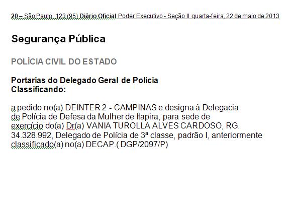 Publicação no Diário Oficial desta quarta-feira (22 /05), a designação de uma Delegada de Polícia para a Delegacia de Defesa da Mulher de Itapira