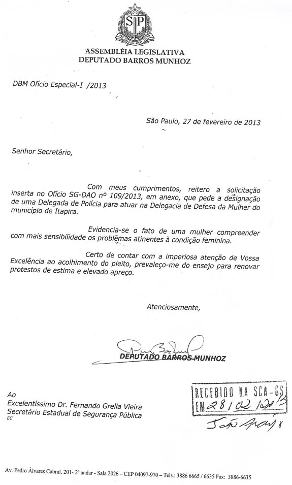 Em 27 /02 /2013: Deputado Barros Munhoz solicitando ao Secretário de Segurança do Estado, Fernando Grella a designação de uma Delegada de Polícia para a Delegacia de Defesa da Mulher de Itapira
