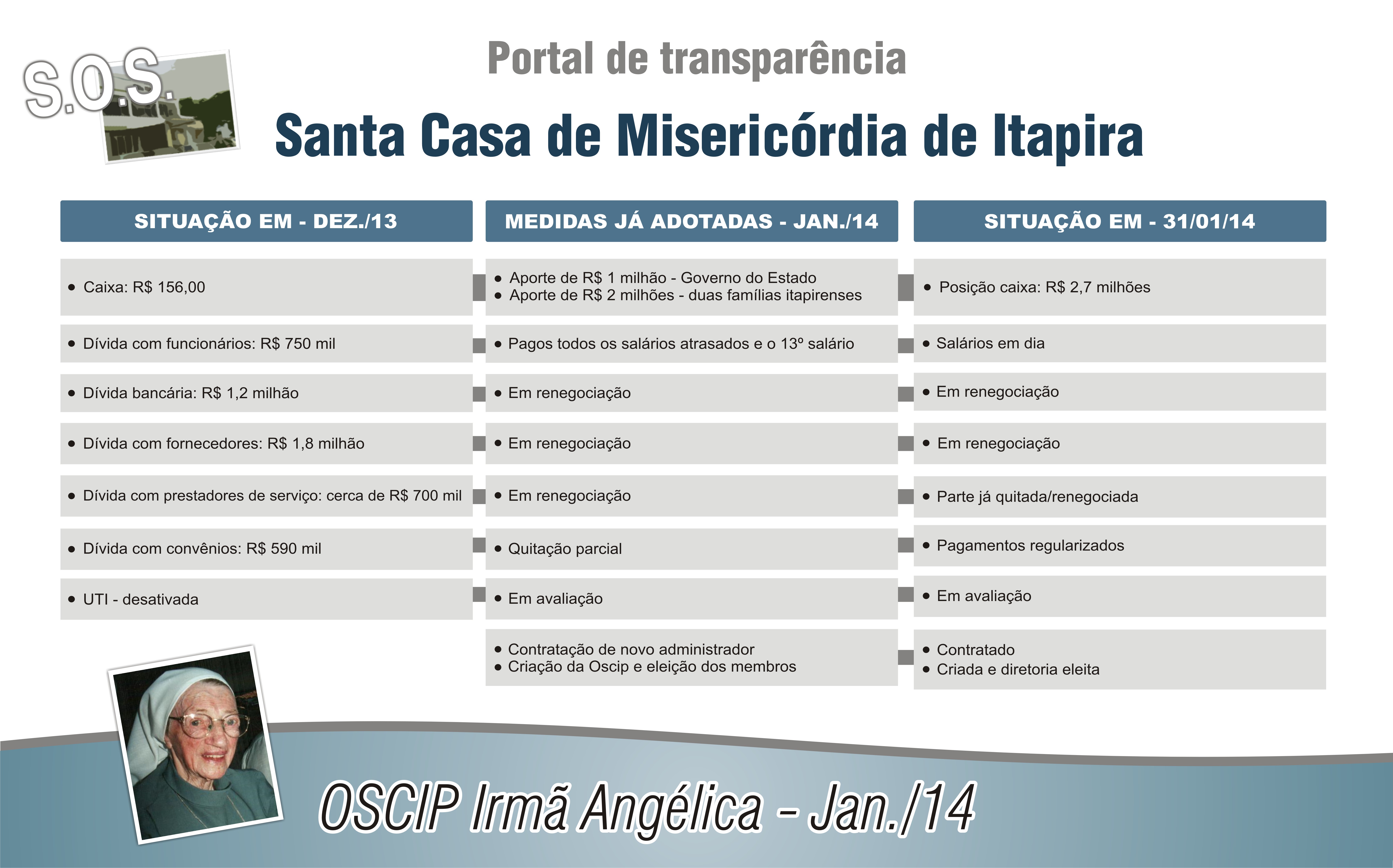 02/02/2014 | Oscip Irmã Angélica divulga prestação de contas de janeiro da Santa Casa A Oscip (Organização de Sociedade Civil de Interesse Público) Irmã Angélica, criada para salvar a Santa Casa de Misericórdia de Itapira, divulgou sexta, 31, o relatório de prestação de contas de janeiro. Conforme havia sido anunciado pelo diretor-presidente do Cristália, Ogari de Castro Pacheco, em 13 de dezembro do ano passado, os débitos a serem pagos com urgência totalizavam cerca de R$ 3 milhões. Na época, ele confessou que tinha recorrido à intervenção do deputado estadual Barros Munhoz (PSDB) para que o governo do Estado de São Paulo subsidiasse parte da dívida.