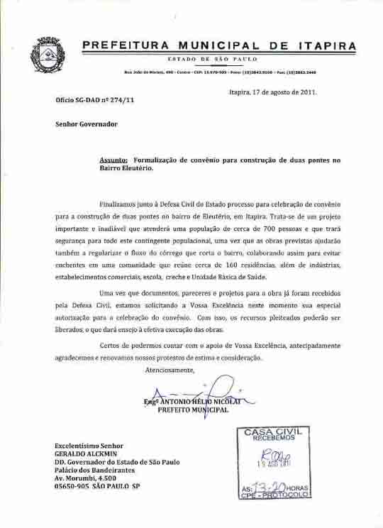 19/08/2011 | Pontes de Eleutério: Alckmin recebe pedido para verbasEm ofício protocolado nessa sexta-feira, 19, no Palácio dos Bandeirantes, junto à Casa Civil, a administração municipal solicitou ao governador Geraldo Alckmin autorização especial para a assinatura de convênio para a construção de duas pontes em Eleutério. A solicitação pode ser a parte final de um processo que resultará em melhoramentos importantes para os moradores do bairro, uma vez que as pontes solicitadas terão papel fundamental na prevenção de cheias naquela localidade.