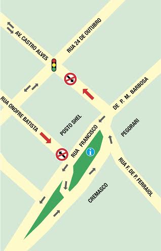 O Departamento de Trânsito, Fiscalização e Transportes informa que a partir do dia 17 de março, segunda-feira, a mão de direção da rua Castro Alves, no trecho entre Rua 24 de Outubro e Rua Francisco de Paula Moreira Barbosa, será alterada. A partir daquela data haverá sentido único da Rua Francisco de Paula Moreira Barbosa para a Rua 24 de Outuburo.