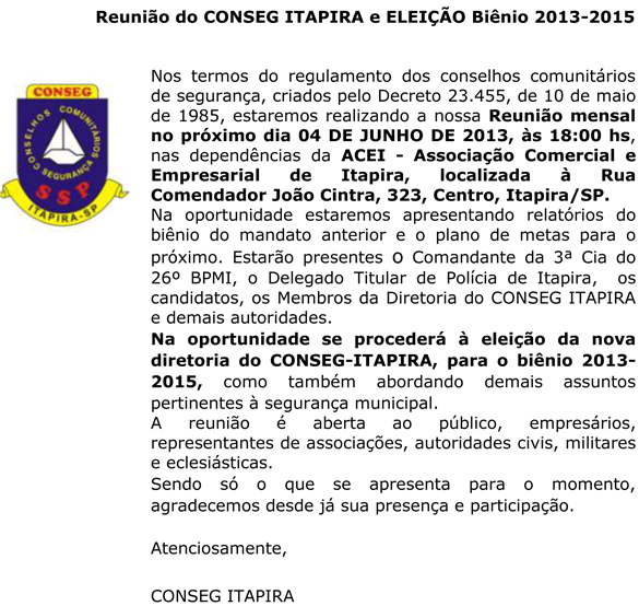 30/05/2013 | Reunião do CONSEG Itapira e Eleição para o Biênio 2013-2015