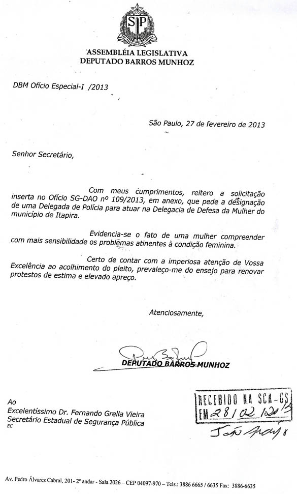 Em 27/02/2013: Deputado Barros Munhoz solicitando ao Secretário de Segurança do Estado,