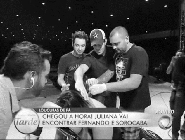 A equipe da Record veio até sua casa no bairro Nosso Teto e gravou imagens,que foram exibidas no dia 06 de agosto, quando a moça foi ao programa comandado por Brito Junior Ana Hickman e Ticiane Pinheiro. Lá estava também algumas amigas e o tatuador Lopez. O momento culminante foi a realização da tatuagem ao vivo. De olhos fechados, primeiro Juliana sentiu a mão do profissional vestindo luvas e disse ter percebido depois que sentiu outras mãos passando por suas costas e sem luvas. “Achei estranho e quando me virei dei de cara com o Fernando e o Sorocaba. Haja coração. Chorei muito de tanta emoção”, disse a moça. Ganhou mimos dos artistas e convite para assistir na mesma semana a gravação no Espaço das Américas a gravação ao vivo de um novo DVD.