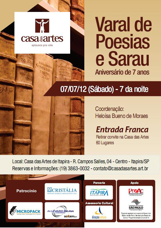 No sábado, dia 07, às 19h o 84° encontro de poetas independentes será realizado na Casa das Artes de Itapira, num sarau comemorativo que contará com a participação de professores e alunos da Casa, como parte dos eventos oferecidos pela associação no Projeto Casa das Artes, que conta com o patrocínio do Laboratório Cristália, Micropack, Allevard Rejna, a assessoria da Direção Cultura e apoio governamental da Prefeitura Municipal de Itapira e Governo do Estado de São Paulo (PROAC). Serão disponibilizados 60 convites para o evento e deverão ser retirados com antecedência na Casa das Artes, Rua campos Salles, 04 – fone: (19) 3863-0032.