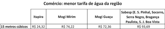 Em Mogi Guaçu os consumidores, tanto residenciais como comerciais, ainda aguardam a aplicação de reajuste sobre a tabela hoje praticada, o que deverá ocorrer, segundo se estima, em junho. Mesmo assim, os valores atualmente cobrados já são maiores para o comércio que os de Itapira. Atualmente, o consumo mínimo de 10 metros cúbicos naquela cidade custa R$ 38,79 e o consumo de 15 metros cúbicos custa R$ 72,36.