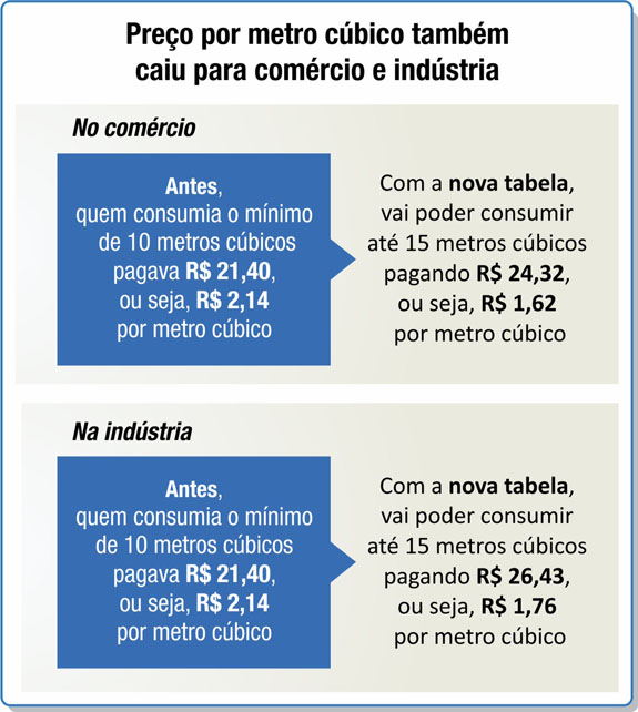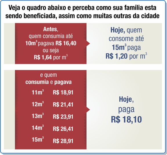 Com a mudança na tabela, o valor do consumo mínimo de 15 metros cúbicos por mês passou a ser R$ 18,10. Para comparar a extensão do benefício, basta lembrar que até a alteração o mínimo de 10 metros cúbicos custava R$ 16,40. A partir daí, quem consumia 11 metros cúbicos pagava R$ 18,91 (já acima do custo mínimo da nova tabela, portanto); quem consumia 12 metros cúbicos, pagava R$ 21,41; quem gastava 13 metros cúbicos, pagava R$ 23,91; quem consumia 14 metros cúbicos, pagava R$ 26,41, e quem tinha um consumo mensal de 15 metros, agora tarifado pelo mínimo, pagava R$ 28,91. Em todas estas faixas, portanto, houve queda no valor pago. Mesmo as famílias enquadradas na chamada tarifa social também tiveram benefício com a nova tabela de tarifas.