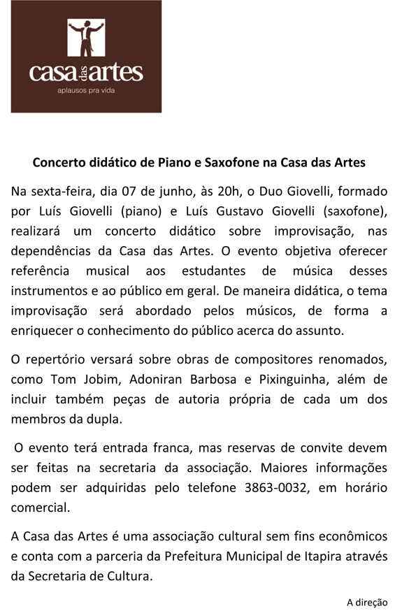 05/06/2013 | Duo Giovelli\: Concerto didático com Piano e Saxofone
