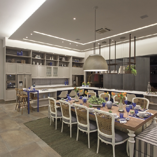 2º lugar: Espaço Gourmet – As decoradoras Sueli Cardoso e Fernanda Podolsky são as responsáveis pelo Espaço Gourmet, de 74 m². O ambiente chama a atenção pelo pé direito de 4 metros. A proposta foi criar um espaço acolhedor, prático, com tecnologia que atendesse as necessidades do gourmet e seus convidados. O projeto de estilo clássico repaginado tem como destaques uma grande ilha em “L” capaz de acomodar mais de 10 pessoas e a área de preparo e cocção dos alimentos, além de armários e prateleiras. A iluminação é desenhada a partir da delimitação da área do balcão. As profissionais optaram embutir toda a iluminação em sancas, criando um efeito indireto e alguns focos pontuais para destaque. Um grande lustre completa o espaço na área da mesa. A jardineira, feita em Corian e desenhada pelas profissionais, com ervas para temperos, adorna o espaço.