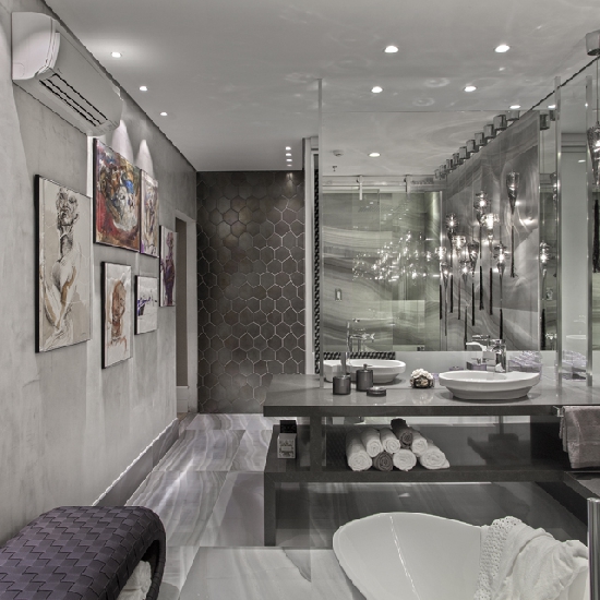 1º lugar: Sala de Banho do Casal – Criar um ambiente de tendência minimalista com uma linguagem moderna foi a premissa da arquiteta Barbara Di Monaco e da designer de interiores Solange Tannuri. O espaço de 19 m² apresenta estilo moderno em tons de cinza e possui áreas e funções bem delimitadas. Os revestimentos empregados são lançamentos do mercado, como o porcelanato de tamanho especial, a bancada dos lavatórios em quartzo e a pintura perolada própria para áreas úmidas. A iluminação é distribuída por Leds embutidos e lustres pendentes que criam o cenário para o banho de imersão.
